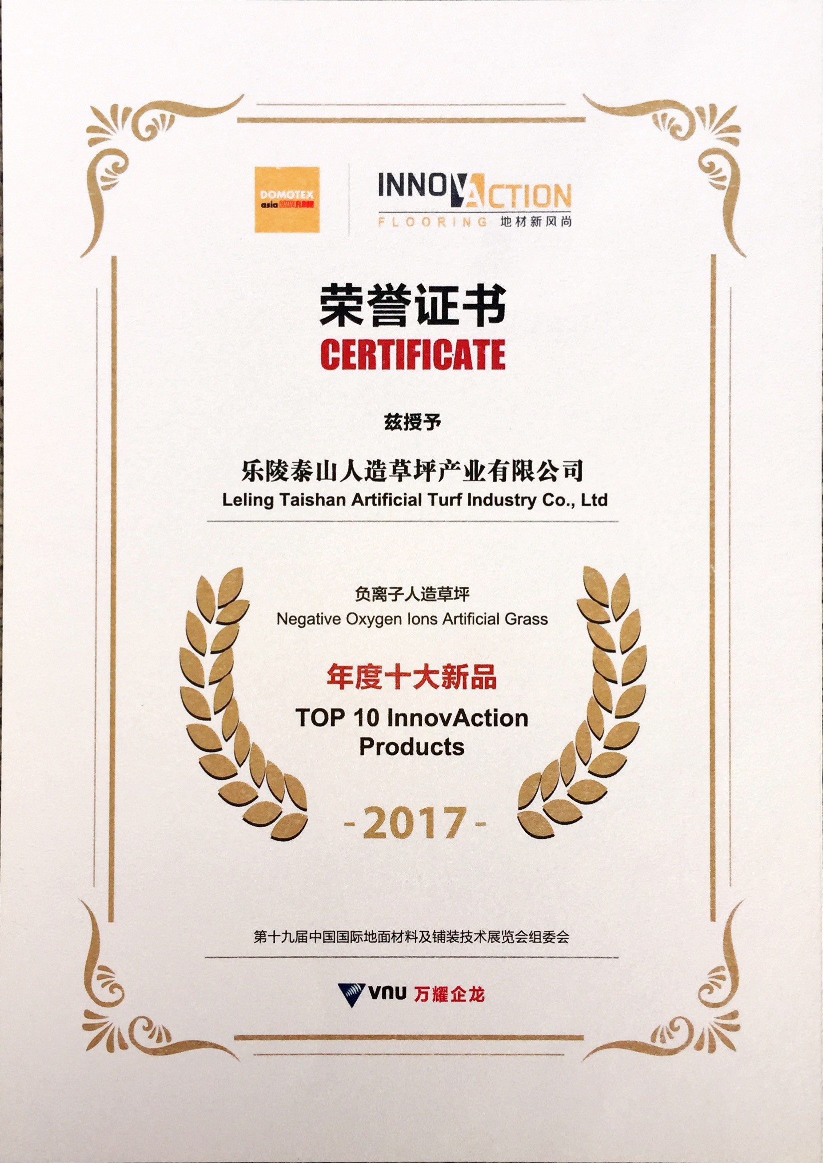 乐陵米兰集团人造草坪产业有限公司负离子人造草坪年度十大新品2017